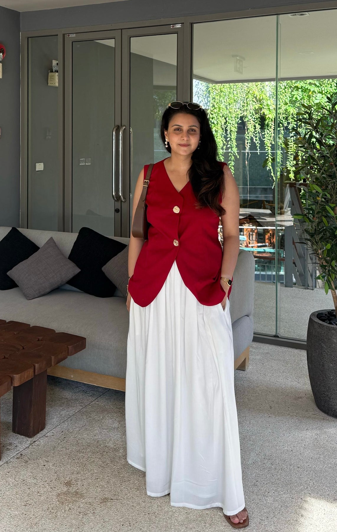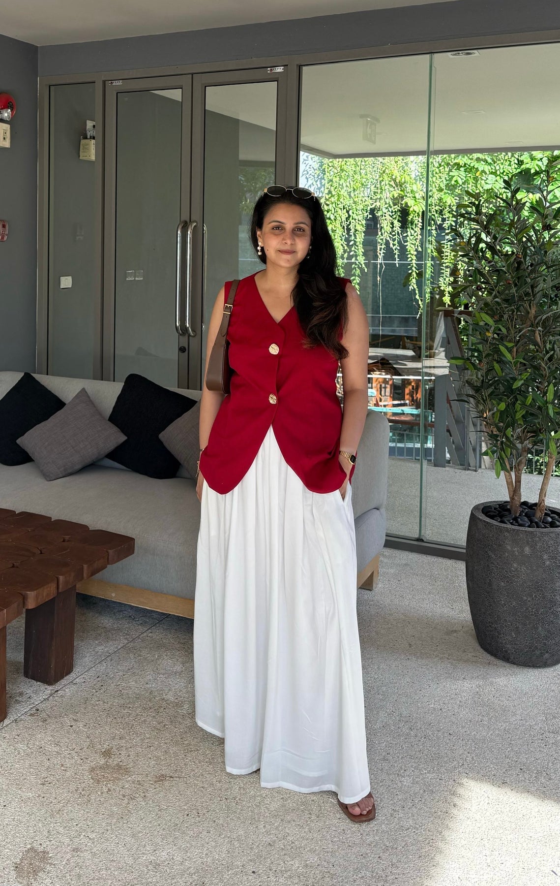 A stunning cherry red maroon-toned waistcoat combined with an off-white elasticated maxi skirt brings the perfect balance of bold and breezy. Fully lined, it features statement bling buttons that elevate the look while a tying detail at the back allows you to cinch the waist for the perfect fit. Formal yet fresh—ideal for spring/summer with a touch of sophistication!