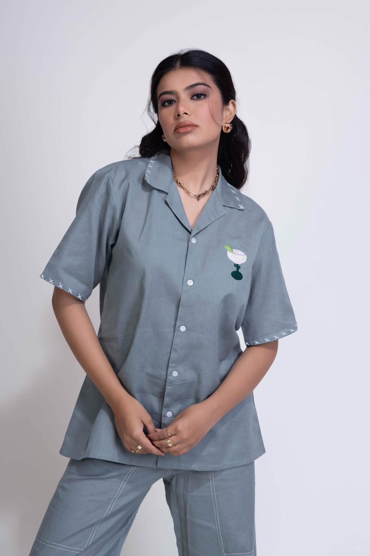 MINT MARGARITA SHIRT – A fresh and breezy unisex mint shirt with a playful twist. Featuring a cute margarita embroidery patch and delicate cross-thread hand embroidery along the collar and sleeves, this piece is the perfect blend of fun and finesse. Light, stylish, and effortlessly cool—ideal for a relaxed yet statement-worthy look! 🍃🍸✨