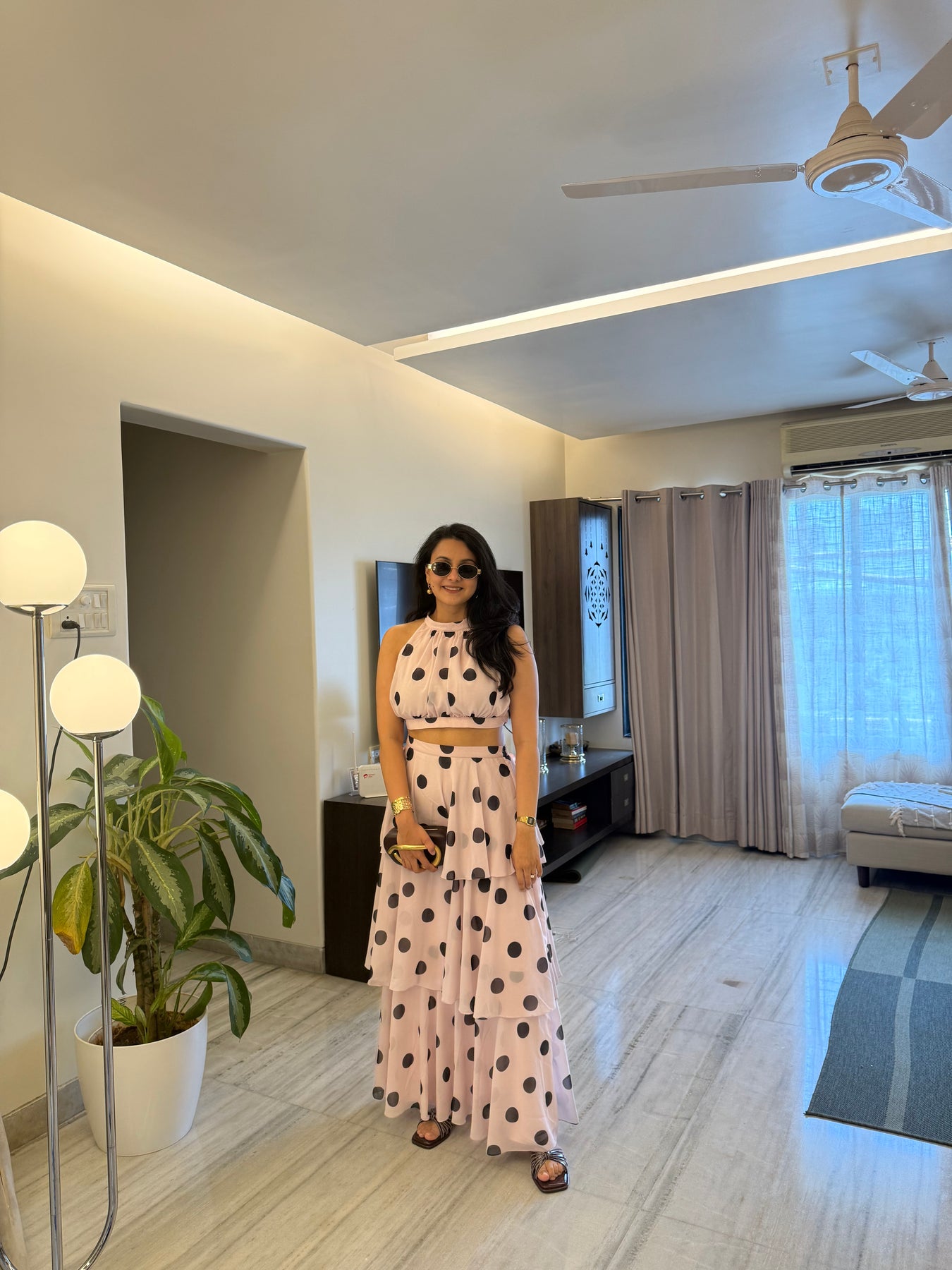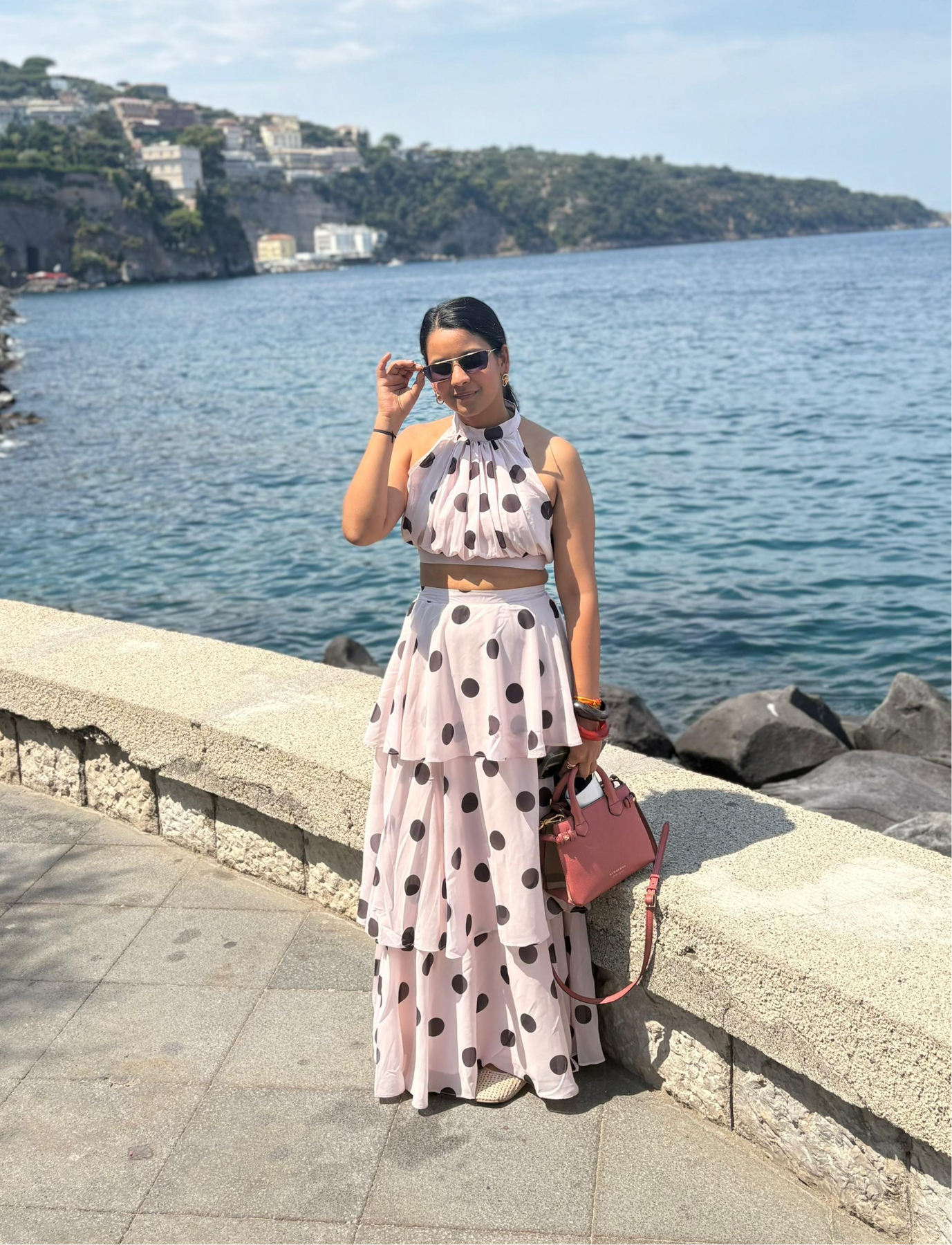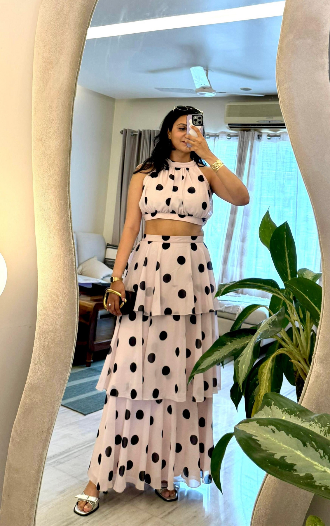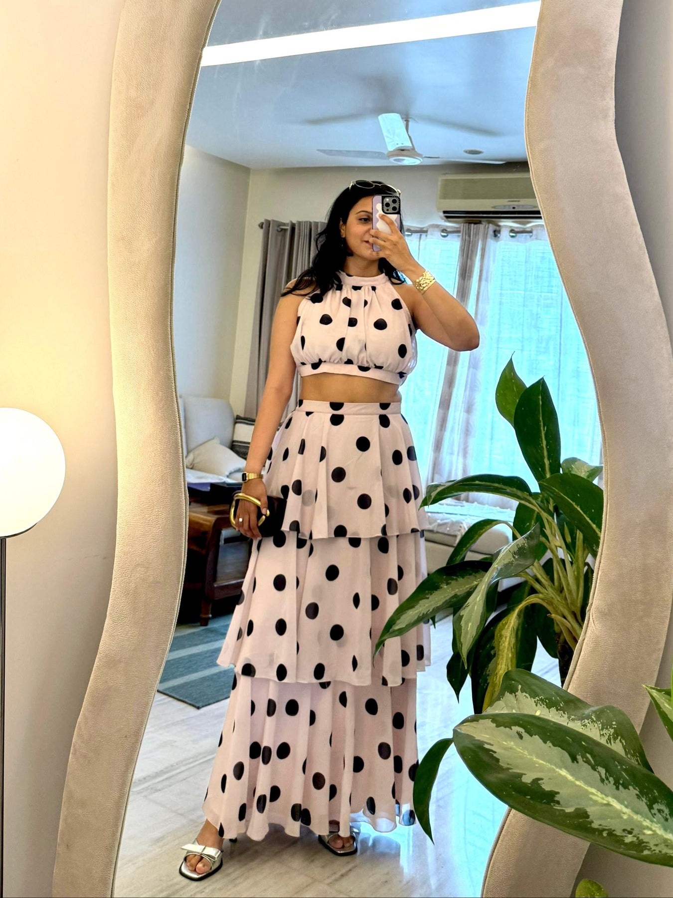 Featuring a crop top and a flowing, tiered maxi skirt — all wrapped in bold polka dots on creamy soft pink fabric — this look is elegance with a twist. Perfect for summer soirées, garden brunches, or that vacation photo moment that turns heads.