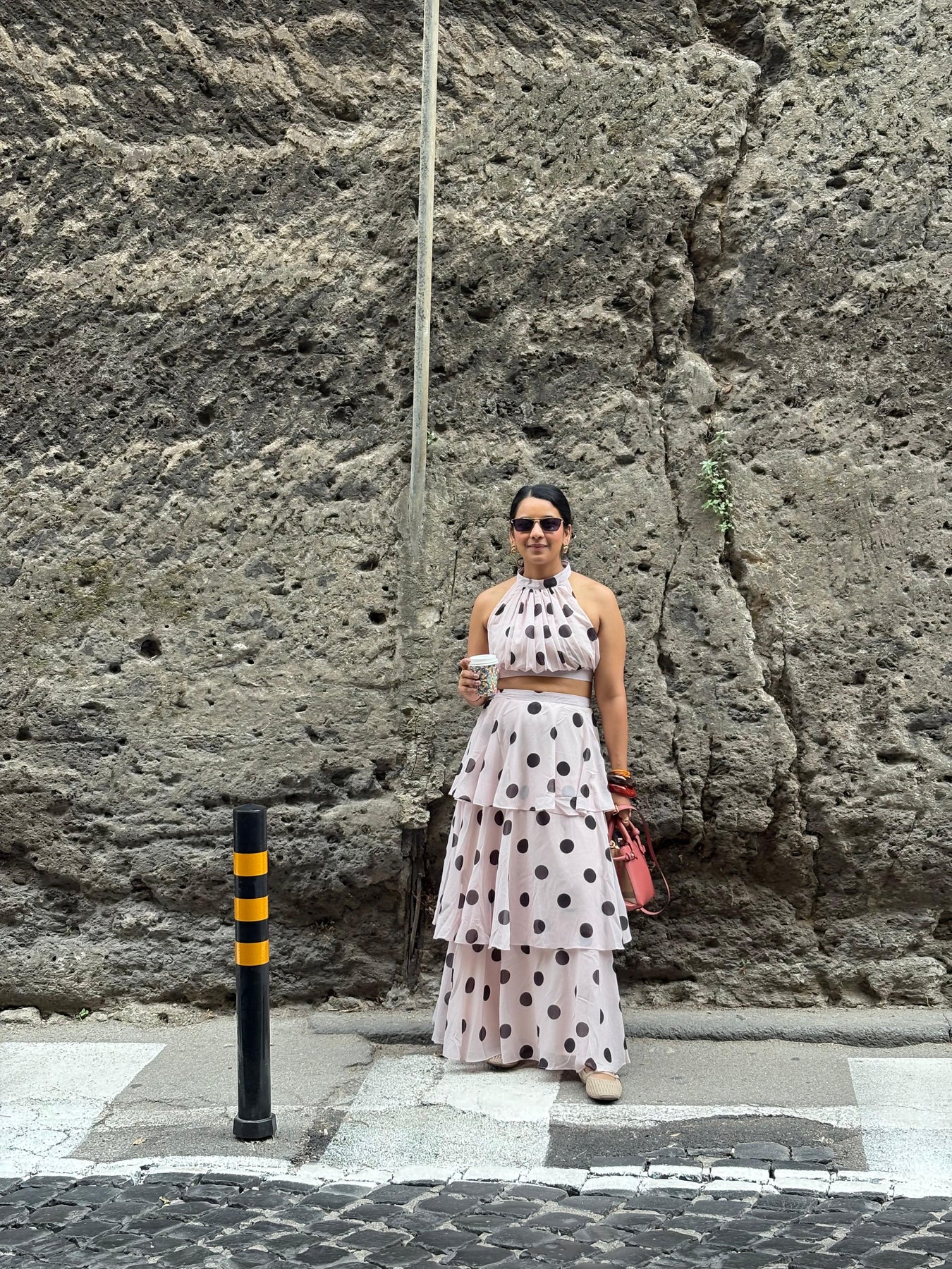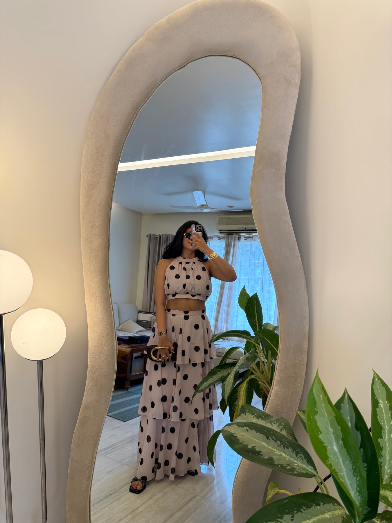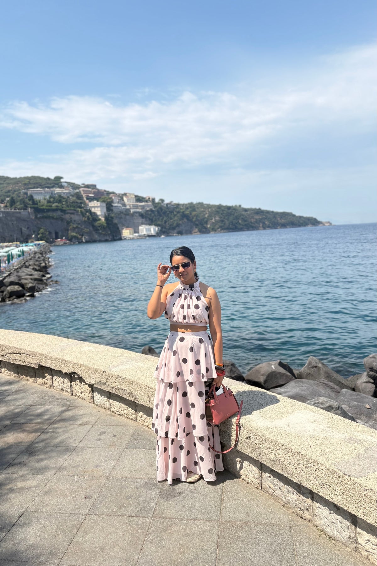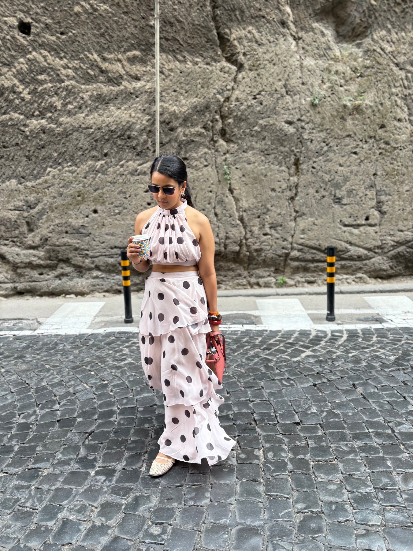 Featuring a crop top and a flowing, tiered maxi skirt — all wrapped in bold polka dots on creamy soft pink fabric — this look is elegance with a twist. Perfect for summer soirées, garden brunches, or that vacation photo moment that turns heads.