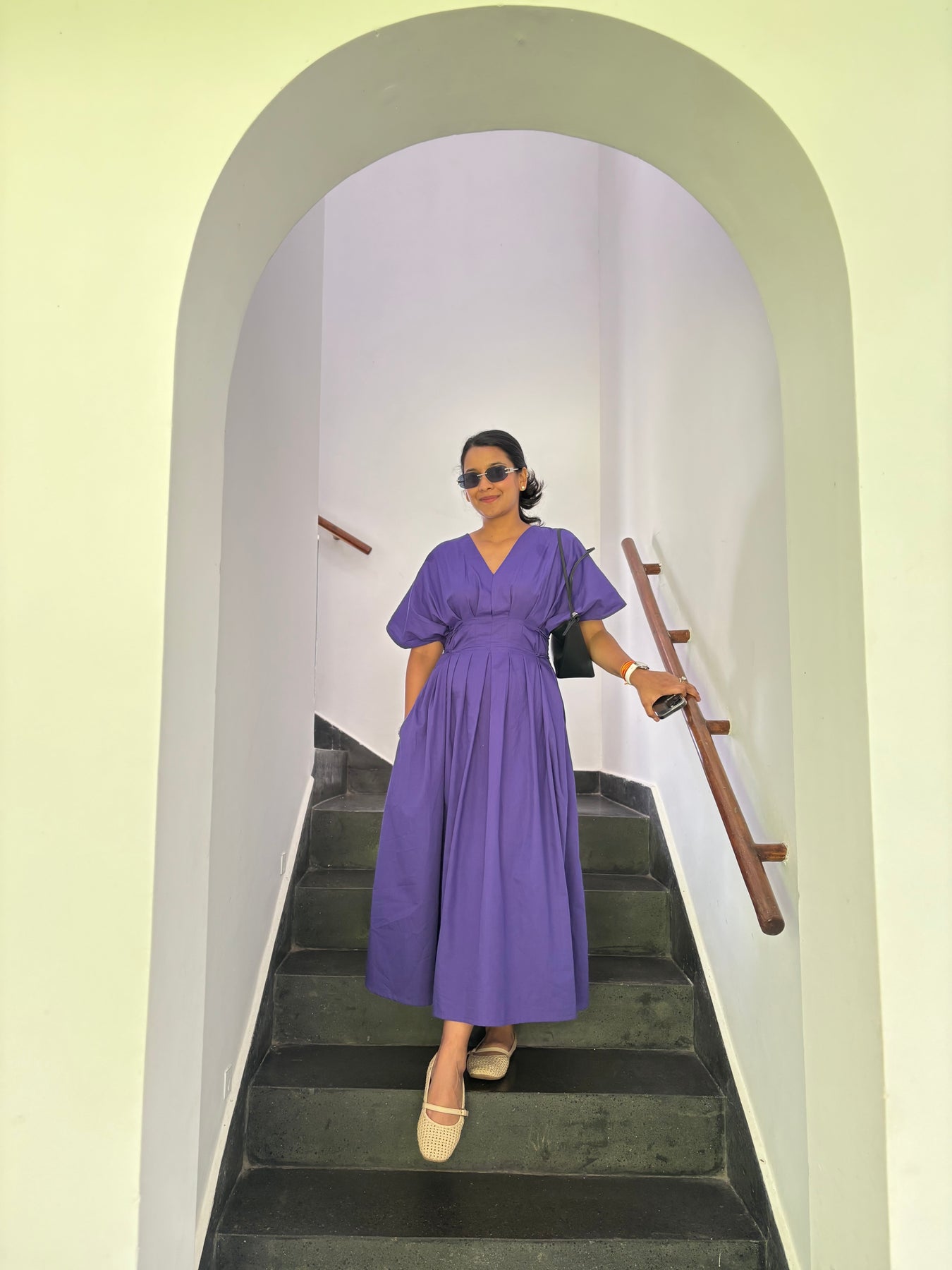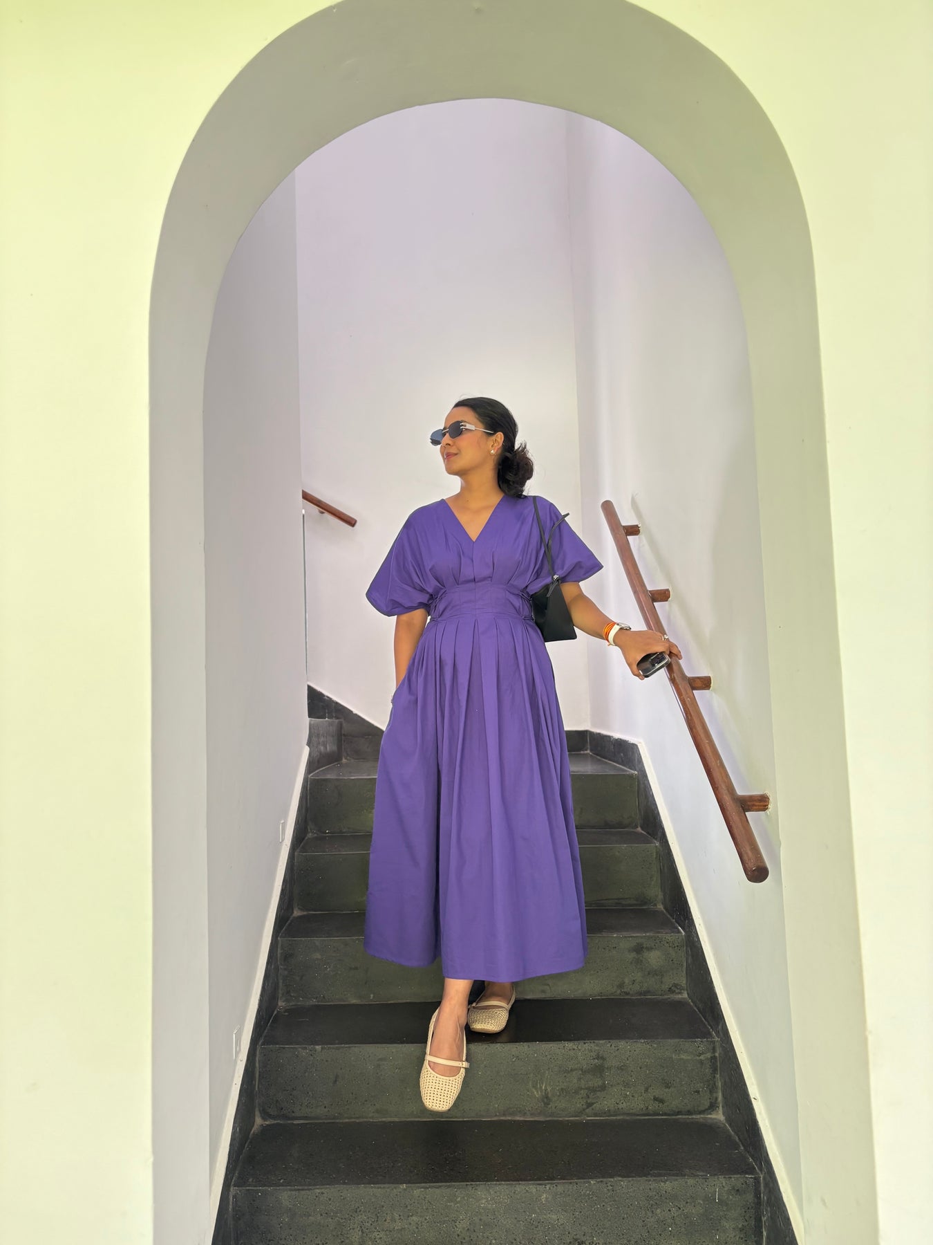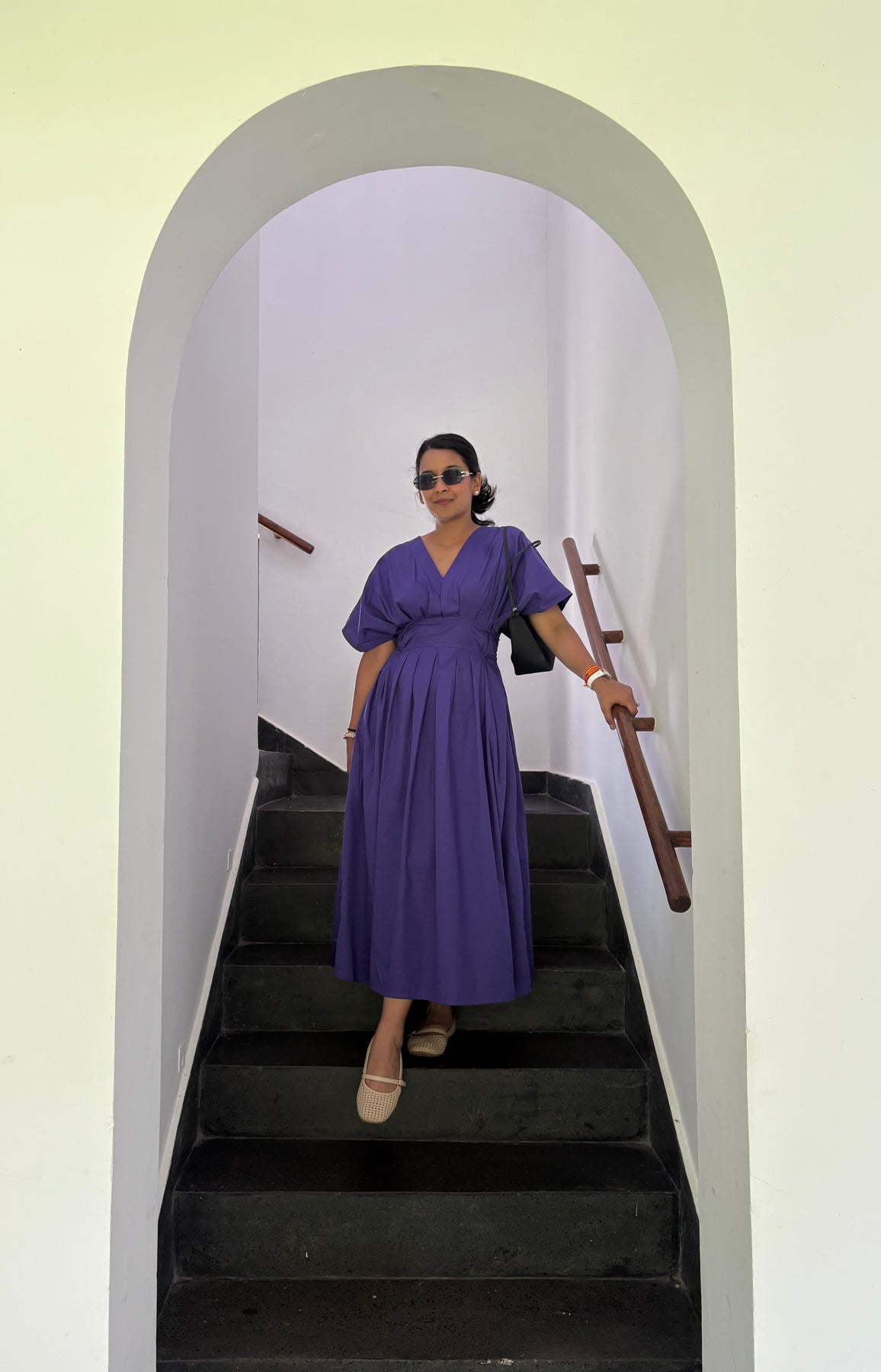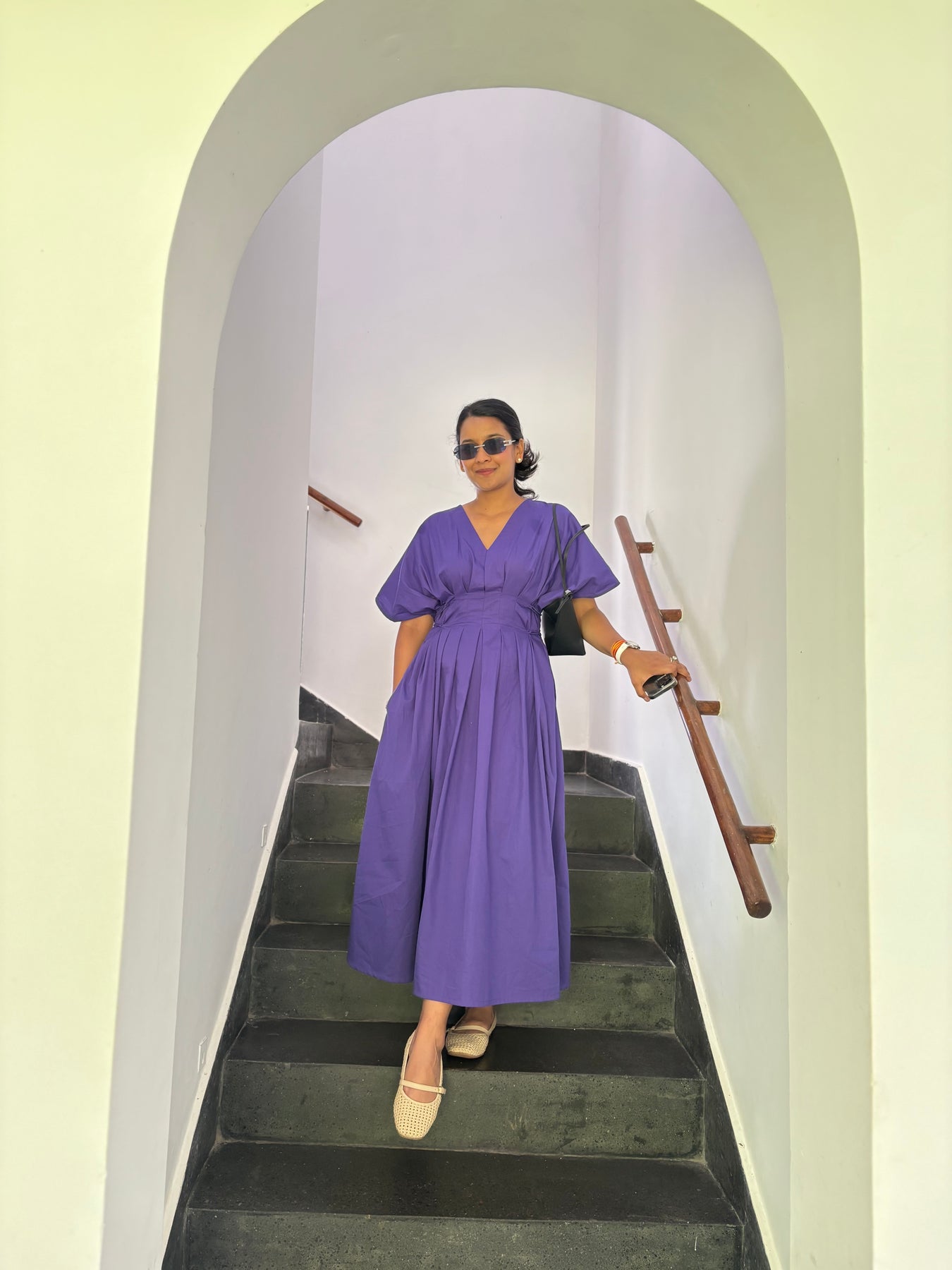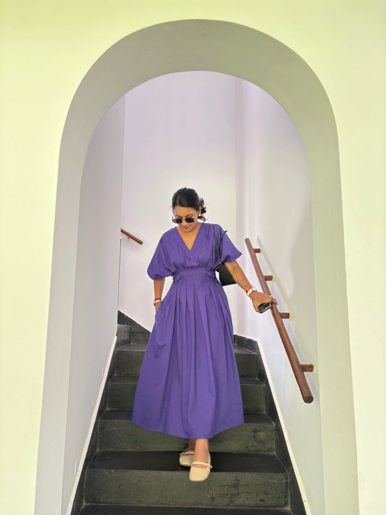 This vibrant purple/plum midi dress features a soft V-neckline, relaxed sleeves, and a cinched waist that flatters without feeling restrictive. You can cinch the dresses in the front or at the back using the strings.