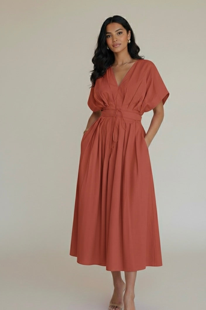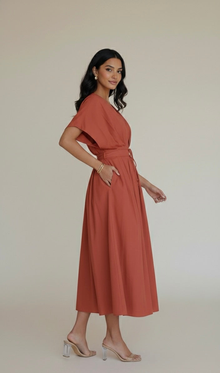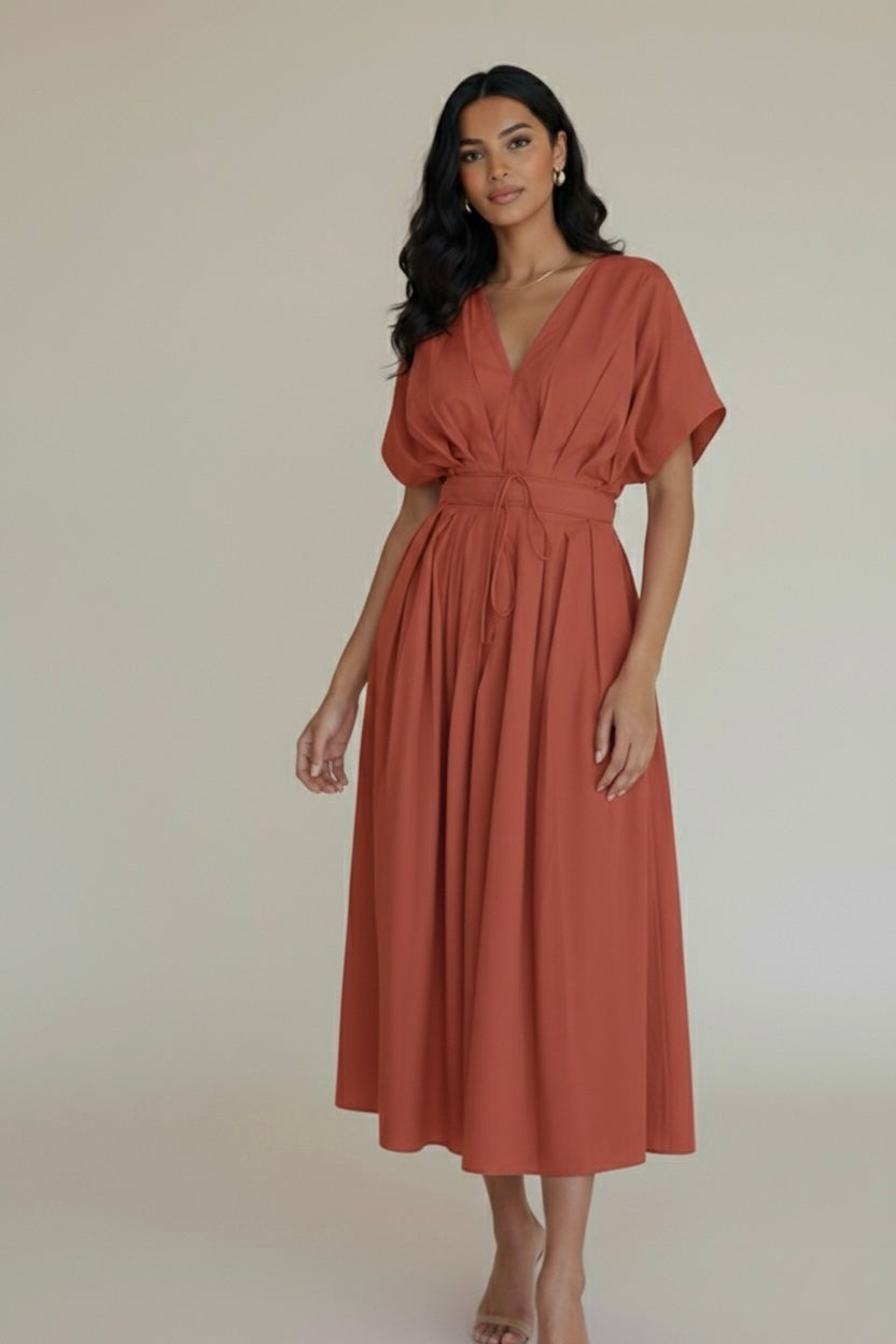 This vibrant rust midi dress features a soft V-neckline, relaxed sleeves, and a cinched waist that flatters without feeling restrictive. You can cinch the dresses in the front or at the back using the strings.