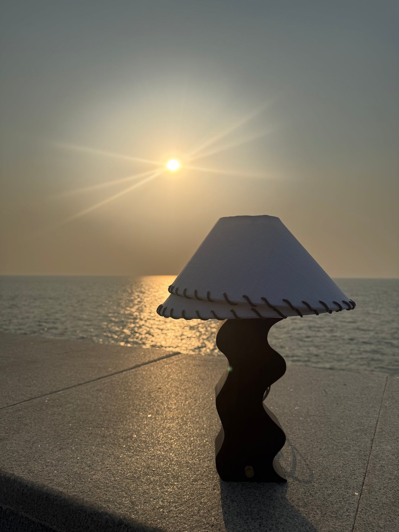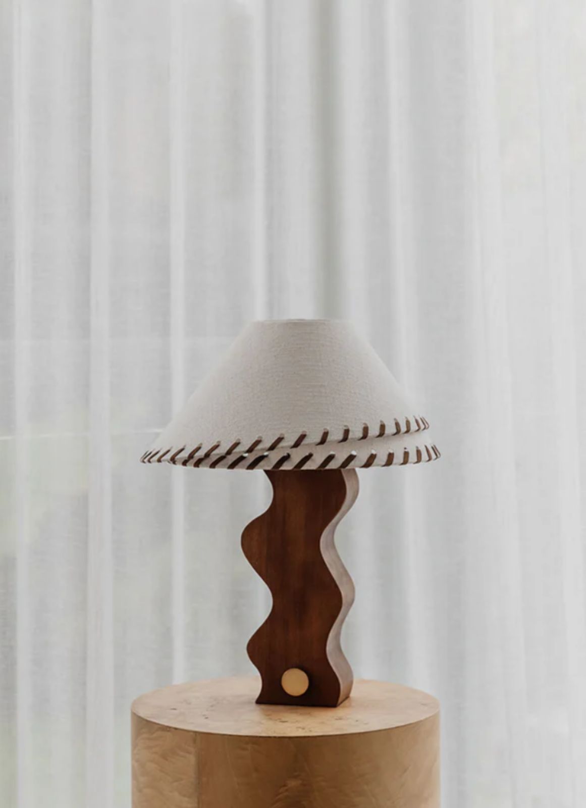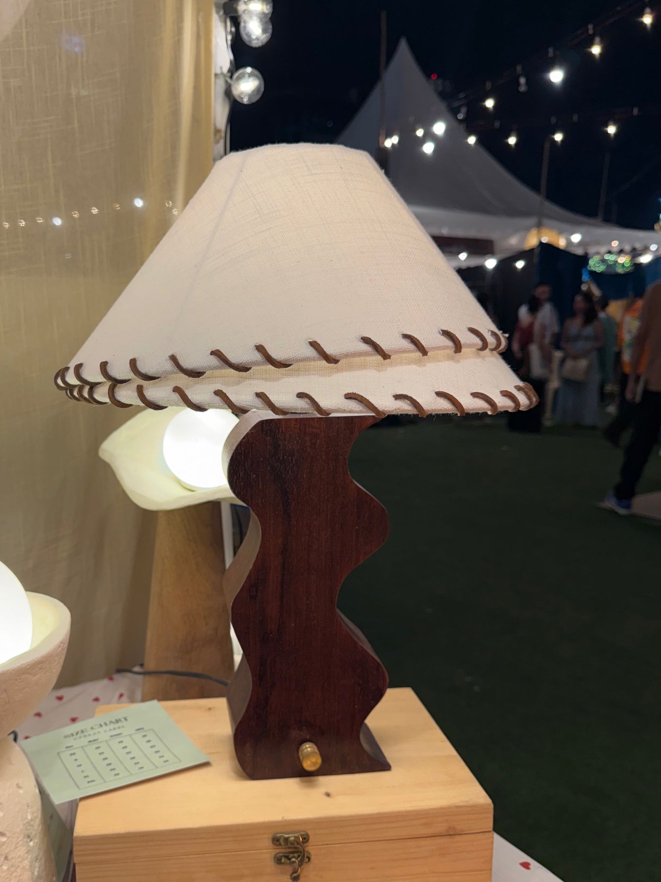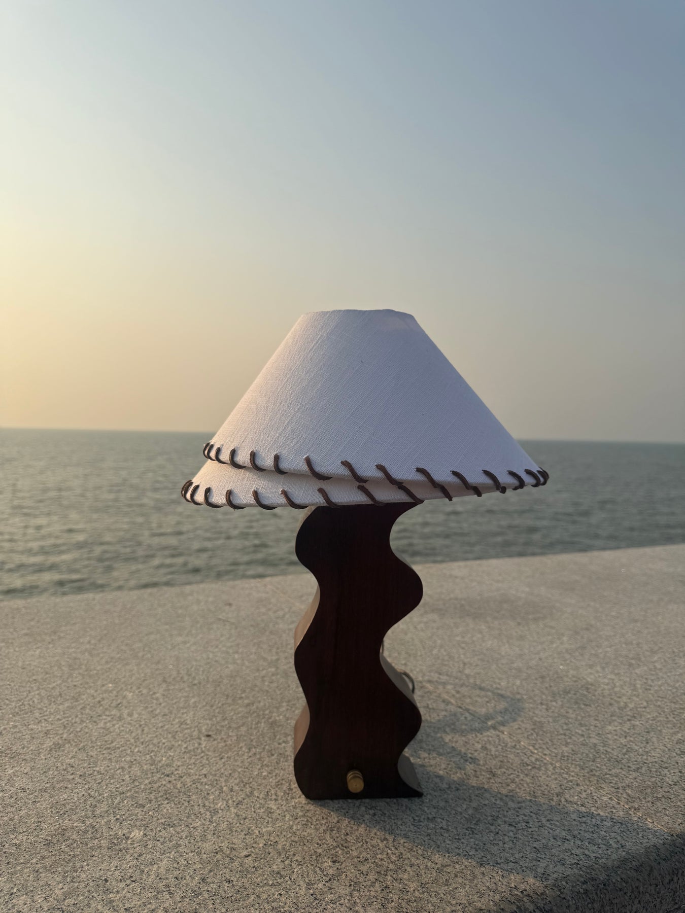 Add a touch of organic charm to your space with this sculptural wooden lamp. Featuring a wavy, hand-crafted base and a textured fabric shade with stitched detailing, it blends modern design with warm, natural tones — perfect for cozy corners and minimalist interiors.Details: